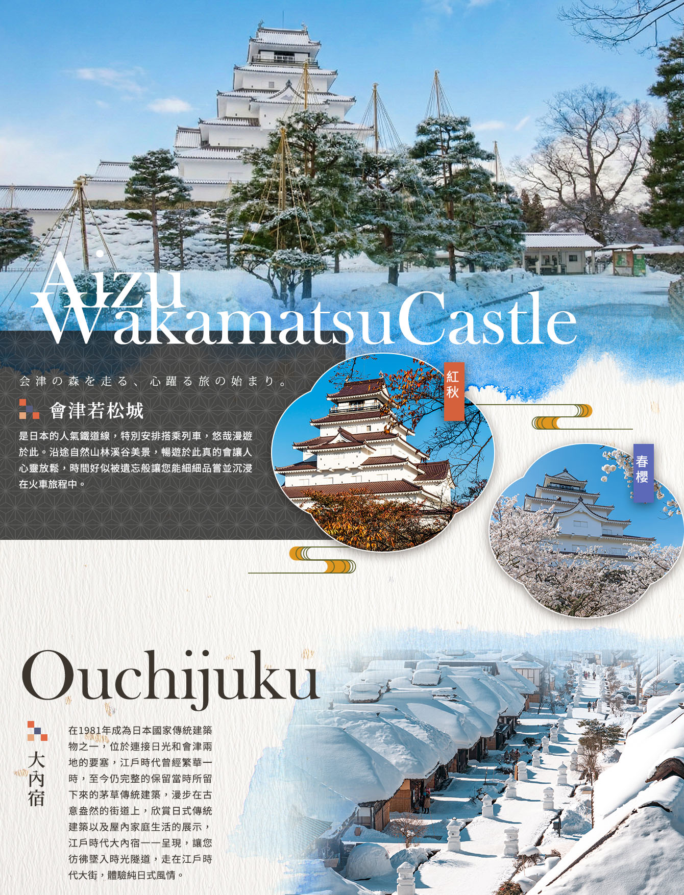 【會津若松城】最早建於西元1384年,迄今有六百多年歷史,此城天守閣之造形有如展開兩翼在空中飛舞的白鶴,姿態優美,因此有『鶴城』之美稱。此城是日本近代有名的歷史舞台,1868年10月發生的戊辰戰爭中,維新政府軍來到會津若松城下,與代表舊幕府勢力的會津藩士展開決戰。一群年僅15、16歲的少年被編成白虎隊奮勇迎敵,彈盡糧絕之際他們感嘆守城淪陷在即,於是20名隊員全體切腹自盡,留下令人唏噓的故事。