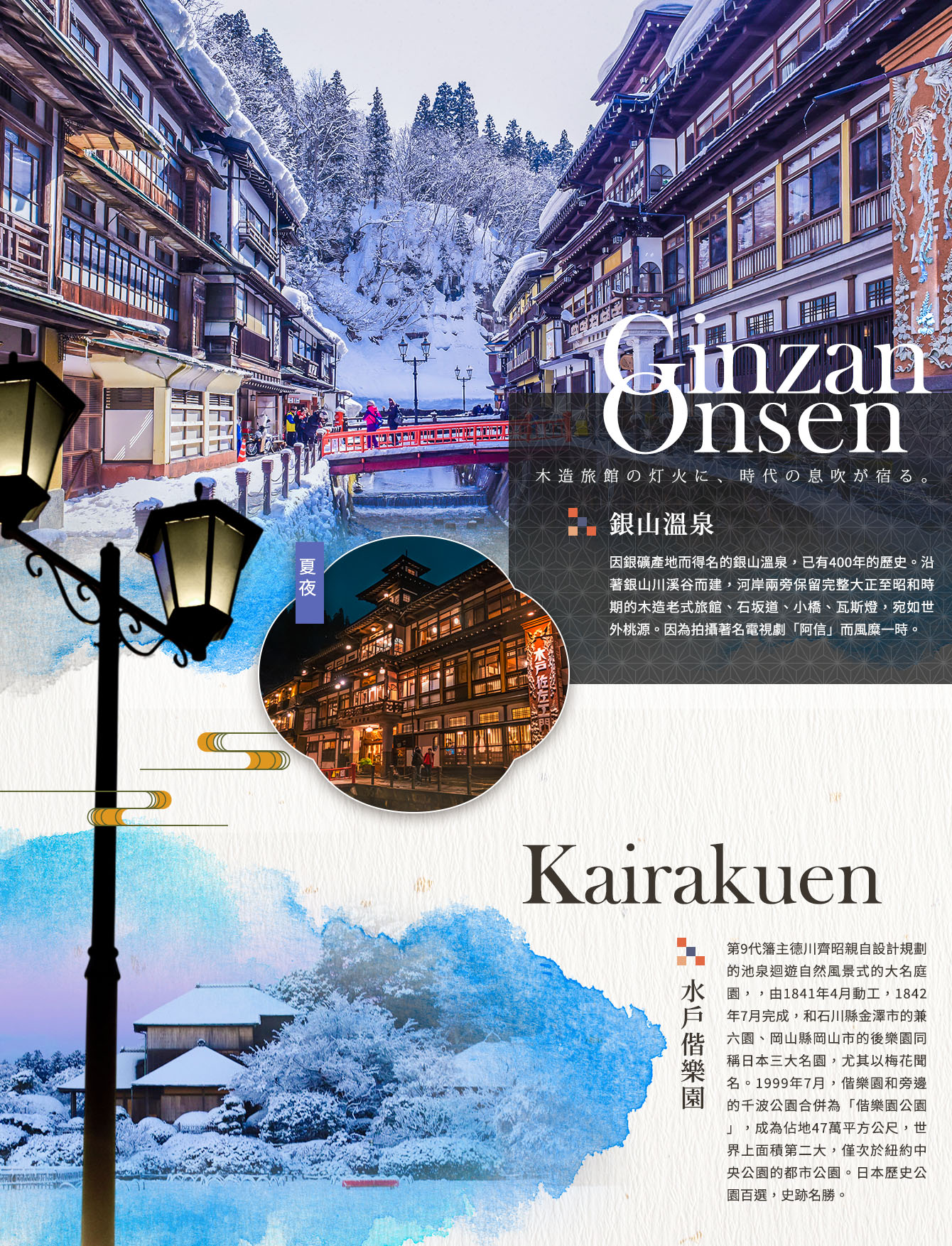 【銀山溫泉街】因銀礦產地而得名的銀山溫泉,已有400年的歷史。沿著銀山川溪谷而建,河岸兩旁保留完整大正至昭和時期的木造老式旅館、石坂道、小橋、瓦斯燈,搭配潺潺水流,氣氛寧靜,宛如世外桃源。銀山溫泉因為拍攝著名電視劇「阿信」而風糜一時,劇中是阿信母親打工的地方,阿信因為想念母親也時常來到這裡。也由於受惠「阿信」而爆紅,因此被封為是「阿信的故鄉」。巧合的是,劇中阿信母親打工的溫泉旅館「能登屋」,傳說也是宮崎駿《神隱少女》動畫中繪製的油屋所參考的藍圖。讓我們就跟著阿信的腳步,一起進入宮崎駿的童話世界。