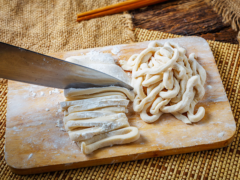 【烏龍學校DIY製作烏龍麵】香川縣是日本首屈一指的烏龍麵之鄉,在體驗活動中製作手打讚岐烏龍麵,只要跟著老師的指導教學,把麵粉揉成麵糰後,再經過踩踏麵糰、桿麵糰和切麵等步驟,就能製作出傳統的讚岐烏龍麵條。