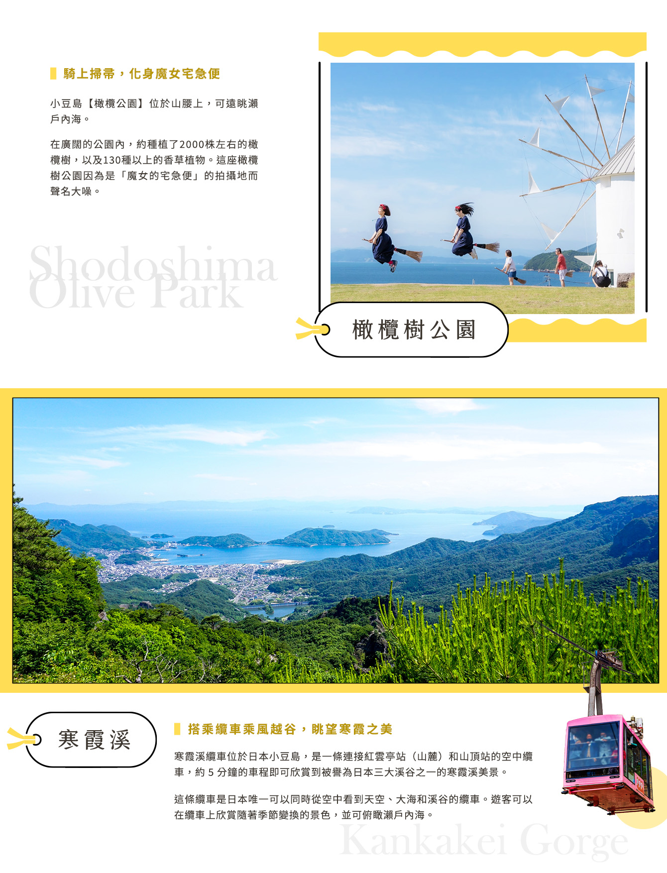 【橄欖公園】日本小豆島盛產橄欖,電影魔女宅急便就在橄欖公園取景拍攝,成為知名景點之一。輕鬆抵達公園高點俯瞰瀨戶內海,藍天白雲襯托綠色橄欖樹與香草,並借一枝掃帚在白色大風車前跳躍拍網美照,都是很棒的體驗。離開前再購買特色橄欖製成商品,紀念這美麗的地方。