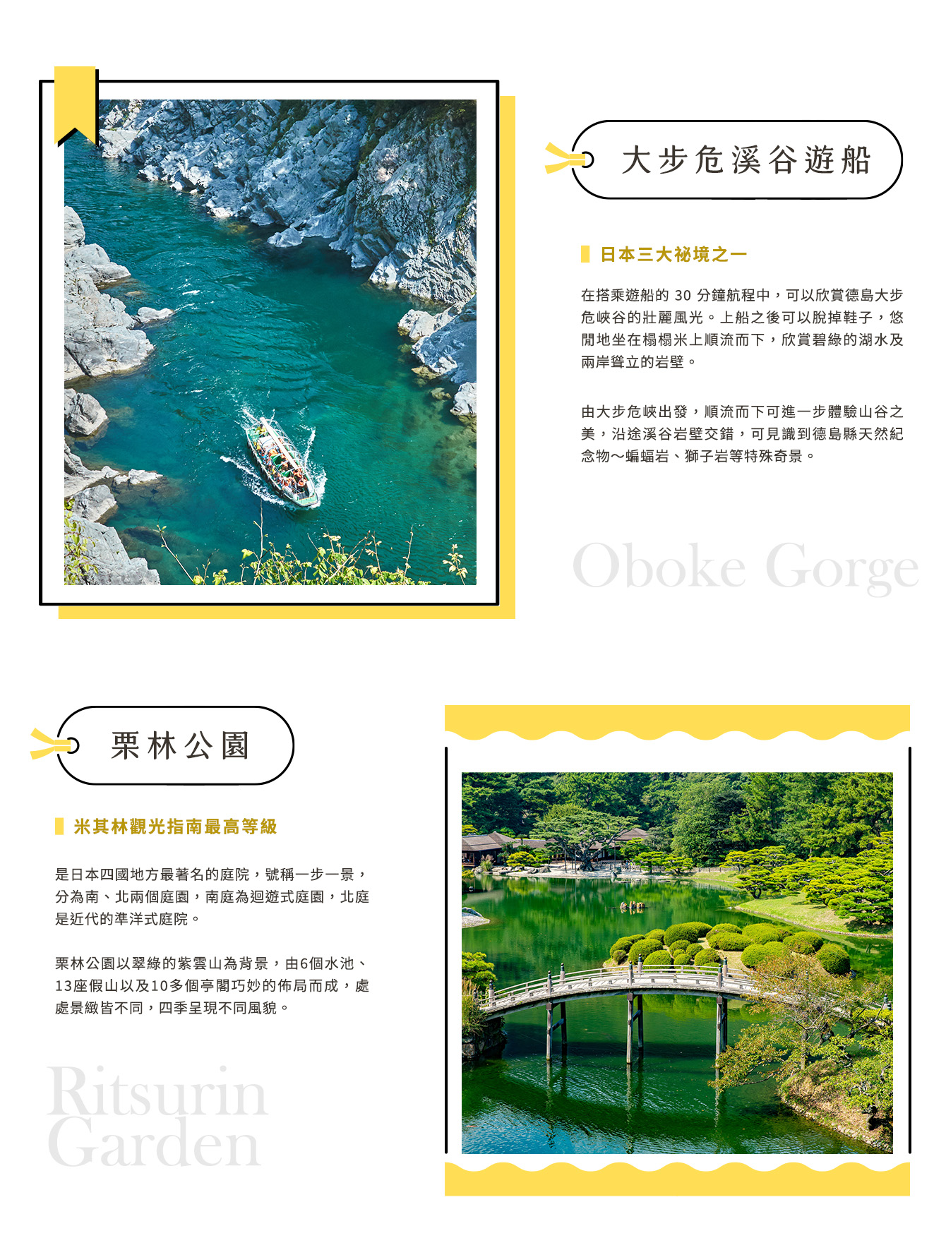 【大步危溪谷遊船】在搭乘遊船的 30 分鐘航程中,可以欣賞德島大步危峽谷的壯麗風光。上船之後可以脫掉鞋子,悠閒地坐在榻榻米上順流而下,有充分的時間可以欣賞碧綠的湖水及兩岸聳立的岩壁。由大步危峽出發,順流而下可進一步體驗山谷之美,沿途溪谷岩壁交錯,可見識到德島縣天然紀念物~蝙蝠岩、獅子岩等特殊奇景。也被稱為《日本三大祕境》之一。