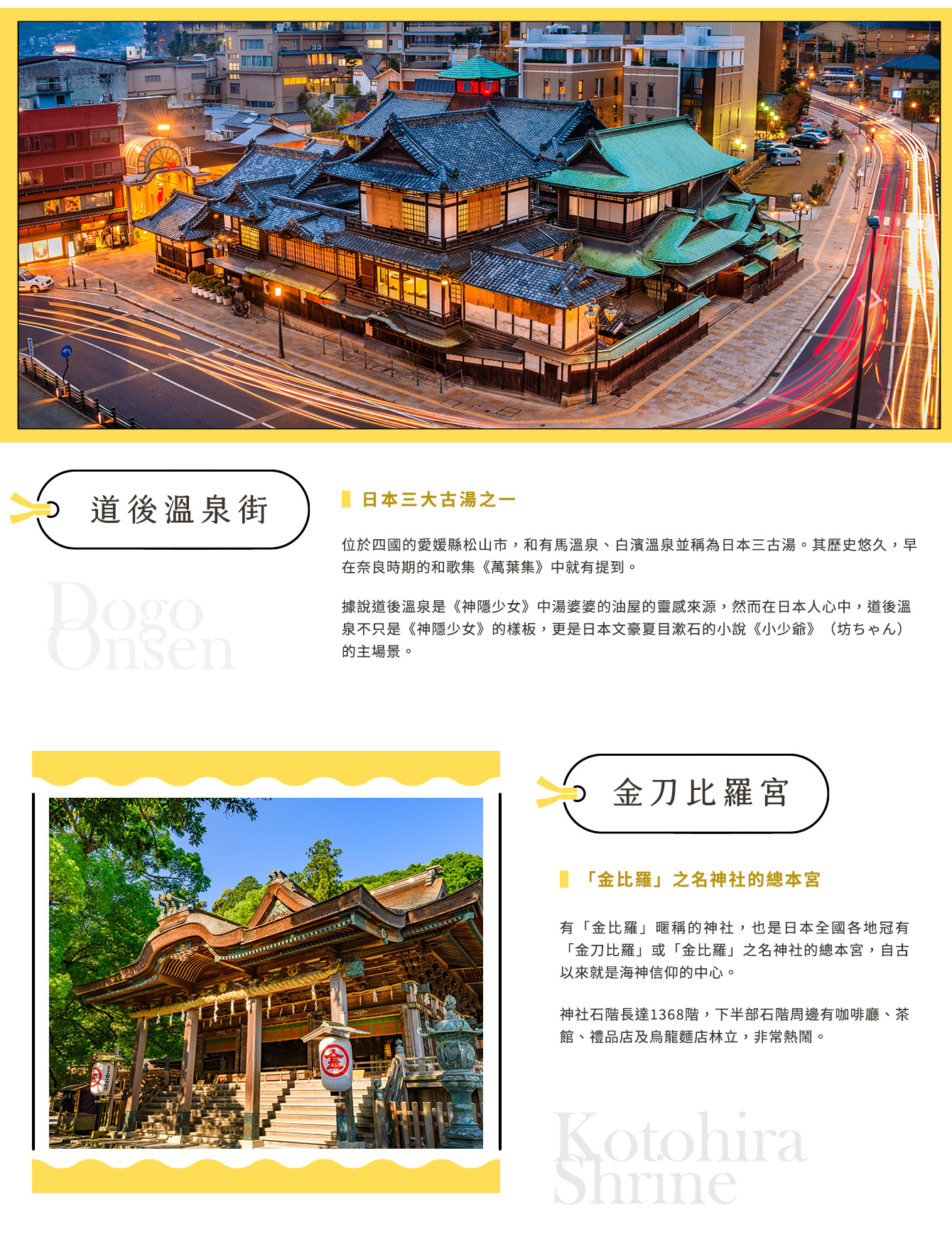 【神隱少女拍攝場景】道後溫泉鄉,就是電影『神隱少女』中所描繪的場景,提供神怪休息的“油屋”─位於愛媛縣的 【道後溫泉本館】 。您可到溫泉商店街上逛逛,歷史悠久的老舖販賣著各種日式仙貝、手工藝品、包著香甜紅豆的小饅頭…最值得一提的就是這裡的聞名遐邇的"少爺糰子"了,這是因為出現在夏目漱石的作品『少爺』中的主人公愛不釋手的一道點心,因此日本書迷們到了這裡可是人手一串呢!晚間住宿位於愛媛縣已有3千年歷史的道後溫泉,素有「四國第一湯」名號,日本古籍中均曾提到它的功效。據說約3千年前開池,號稱日本最古老的溫泉。常被寫入小說中,因而吸引著許多文人逸士來訪。道後溫泉的泉質為弱鹼性單純溫泉,泉溫約40至50度,對神經痛、胃腸疾病及婦人病有效。