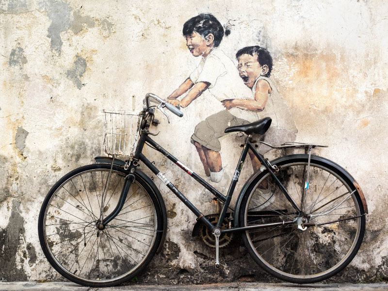 在古蹟上面的壁畫及裝置藝術,檳城整座老城搖身變成一個藝術大畫廊,參觀來自立陶宛的畫家恩尼斯(Ernest Zacharevic)的五幅壁畫,主題包括:姊弟共騎、功夫女孩、爬牆小孩、追風小子…等。恩尼斯是一名年輕藝術家,他在2010年來檳城背包旅行後愛上這個地方,並陸續發表藝術作品,壁畫特別之處在於融合社區與建材特色,透過畫筆來呈現別有意義的壁畫。