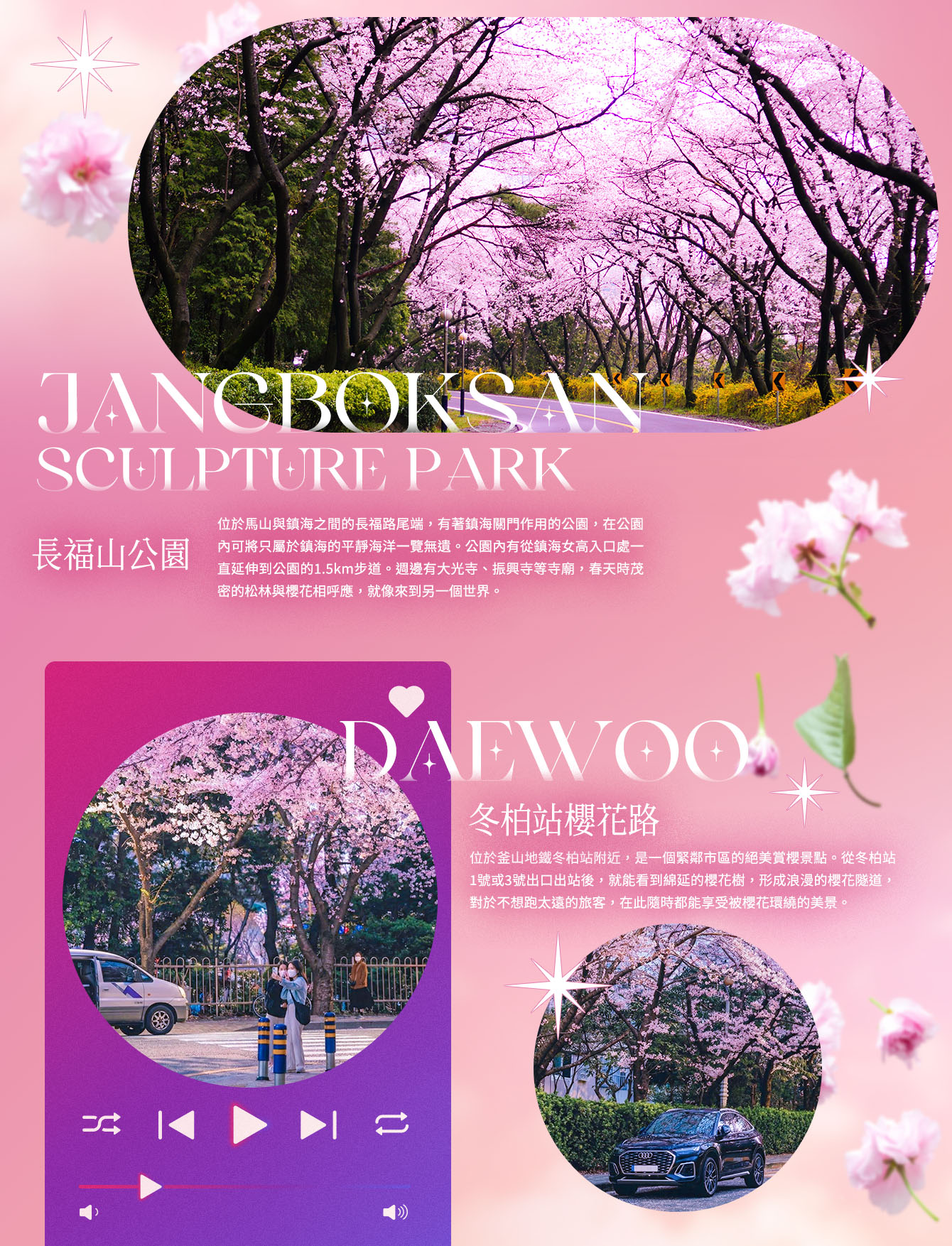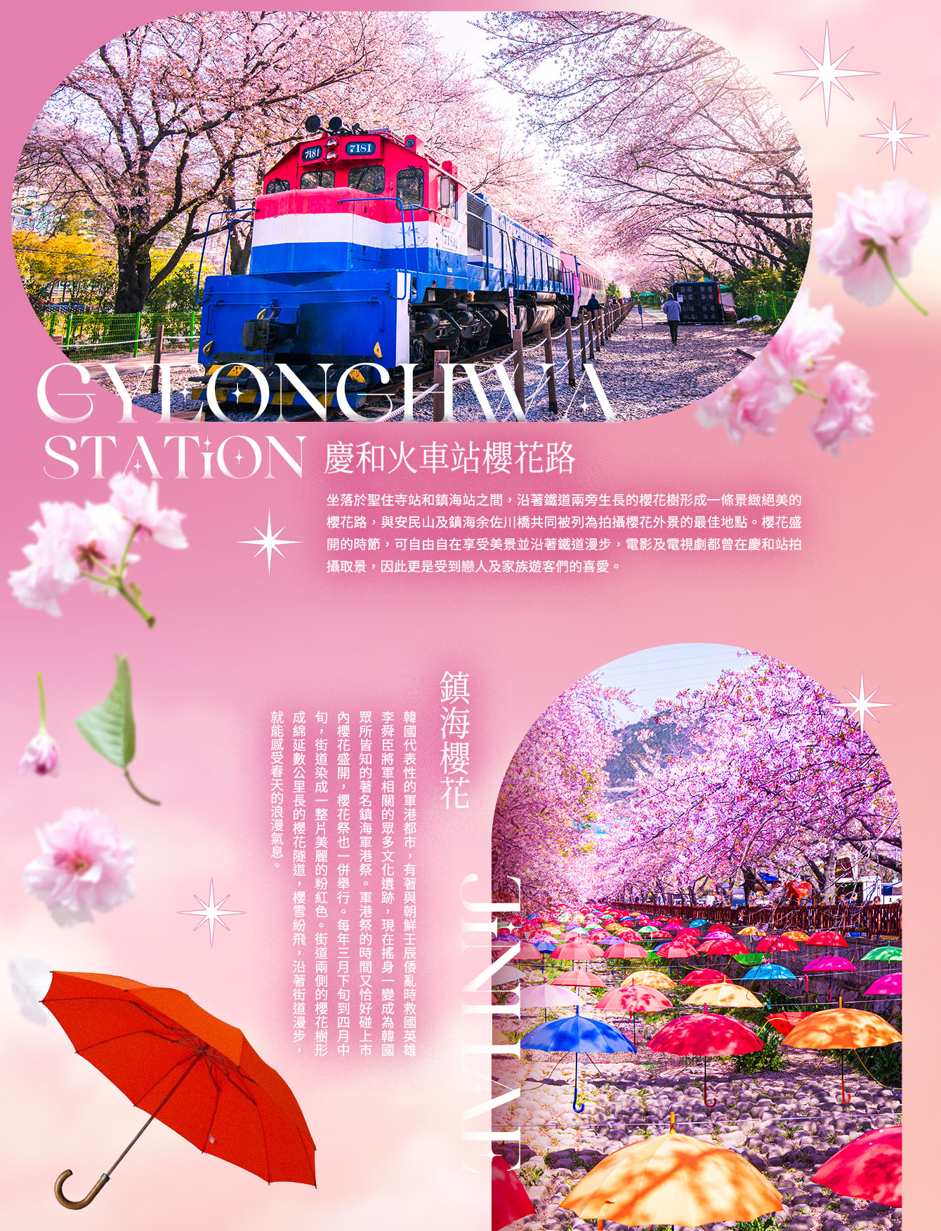 鎮海(櫻花重鎮)→鎮海郵政局(賞櫻)→長福山公園(賞櫻)→CNN 評選推薦~余佐川羅曼史橋(賞櫻)→帝皇山公園(賞櫻)→CNN 評選推薦~慶和火車站(賞櫻)