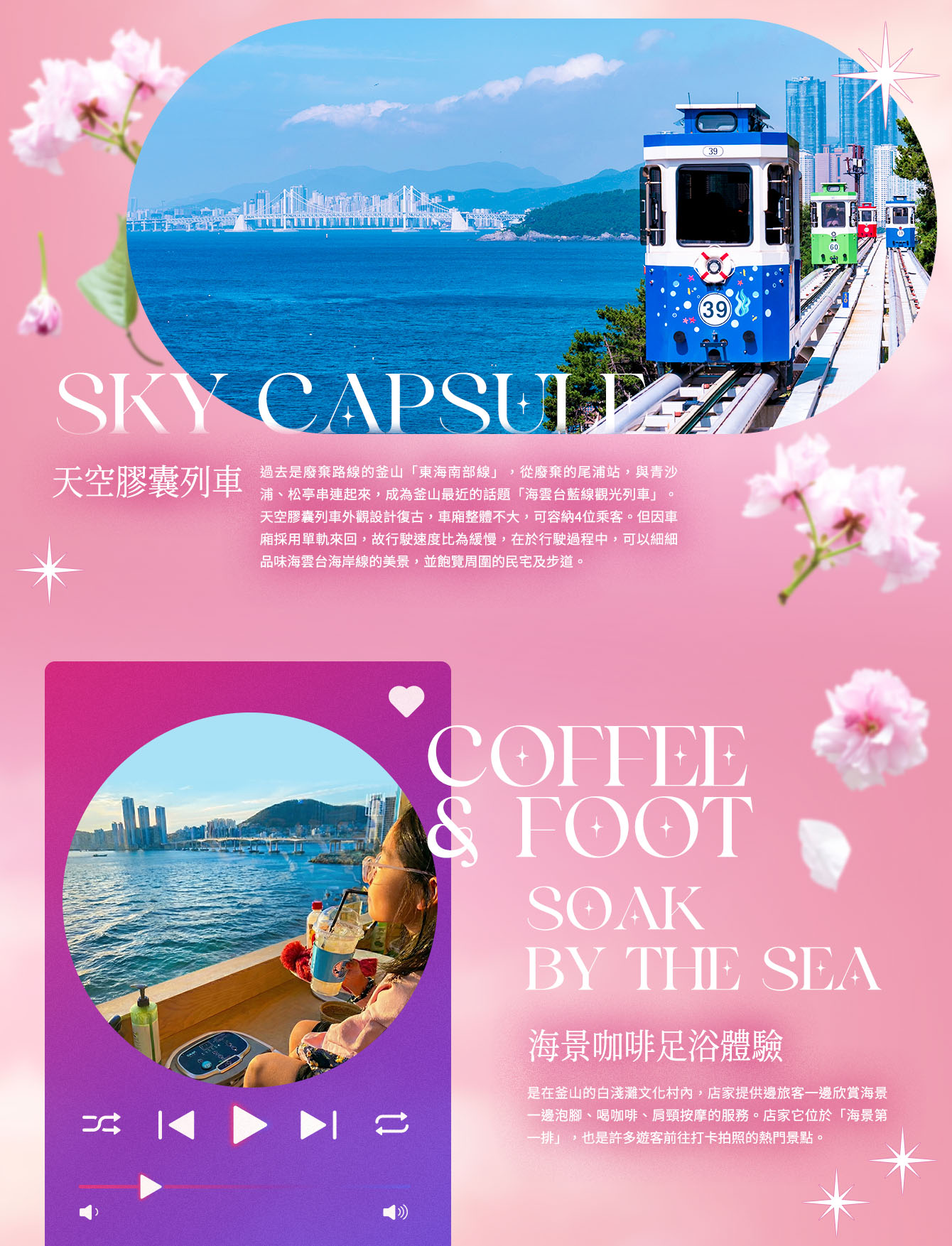 【天空膠囊列車】過去是廢棄路線的釜⼭「東海南部線」,從廢棄的尾浦站,與青沙浦、松亭串連起來,成為釜⼭最近的話題「海雲台藍線觀光列⾞」。天空膠囊列⾞外觀設計復古,⾞廂整體不⼤,可容納4位乘客。但因⾞廂採⽤單軌來回,故行駛速度比為緩慢,在於行駛過程中,可以細細品味海雲台海岸線的美景,並飽覽周圍的⺠宅及步道。