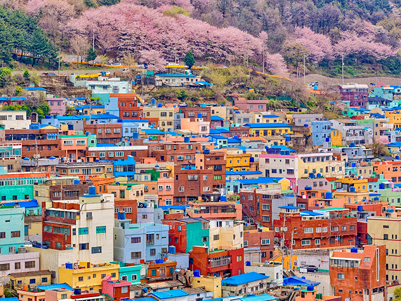 【甘川洞文化村】是見證了釜山歷史之處。1950年代韓戰時,許多避難者來到釜山,最後在此定居生活至今。沿著山麓井然有序的階梯式集體住宅,與四通八達、如迷宮一般的小巷,形成甘川文化村獨有的特殊景觀。這裡原本是釜山老舊的山上住宅區,由於城市再生工程的推動,用各色彩繪與可愛的造景為村落增添了藝文氣息,使這裡搖身一變,成為一年有185萬人次造訪的著名觀光景點。沿著山坡而建,有著可愛蠟筆色的階梯式小房子,還有像迷宮一樣的巷弄,使這裡彷彿童話世界,還曾於2016年獲得大韓民國空間文化大獎的總統獎。造訪甘川文化村,可以享受美麗的自然風景,以及如畫般的村落風光,也可以欣賞設在各個小巷間各種造型的作品,或在駐村作家的工房進行各種工藝體驗,也因此吸引眾多遊客造訪。