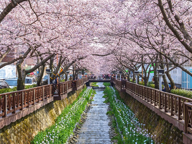 【余佐川羅曼史橋櫻花道】曾是MBC電視臺戲劇《羅曼史》主要拍攝取景地的余佐川,以⾝為鎮海賞櫻聖地為名,劇中兩位主⾓在參觀完鎮海軍港祭後於余佐川的橋座上初次相遇。在經過電視劇播出後,這座橋從此開始被稱作”羅曼史之橋”,並迅速吸引絡繹不絕的遊客慕名前來參觀。每逢4⽉份春季時節,櫻花開滿遍布於整座城市,這也是鎮海被推選為最美麗的賞櫻地區主要原因,從各地遠道⽽來賞花的遊客歡歡喜洗聚集在櫻花樹下郊遊野餐的景象,也成為這裡更加亮眼的⼀道風景。