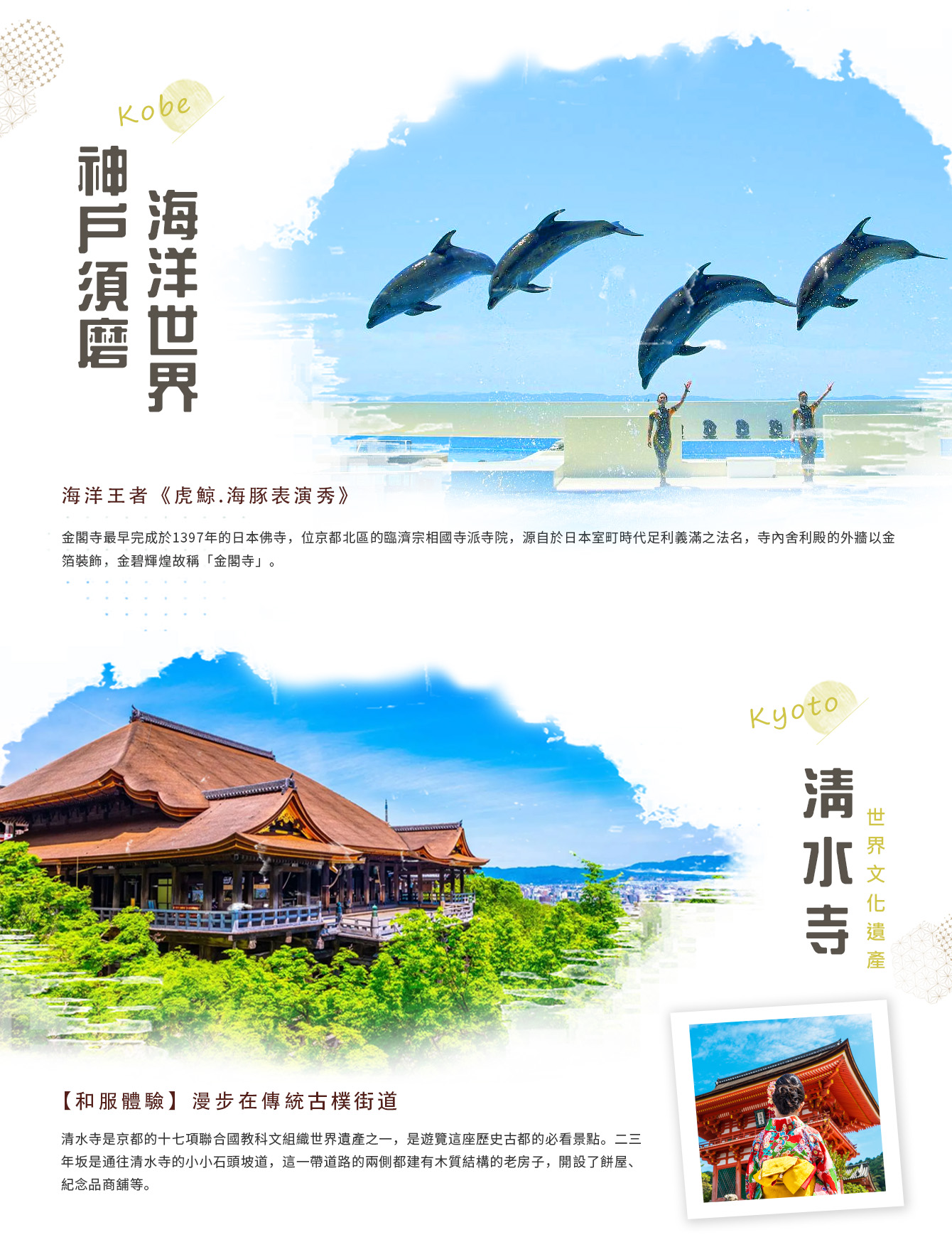 住宿飯店→虎鯨.海豚表演~神戶須磨海洋世界→世界遺產~米其林評鑑三星景點~京都千年名剎.清水寺(入內參觀)~石坂階梯.二、三年坂京風小舖古街散策→特別贈送和服體驗(不含妝髮)→京都最有名的藝妓繁華街~祇園~花見小路~八阪神社→飯店