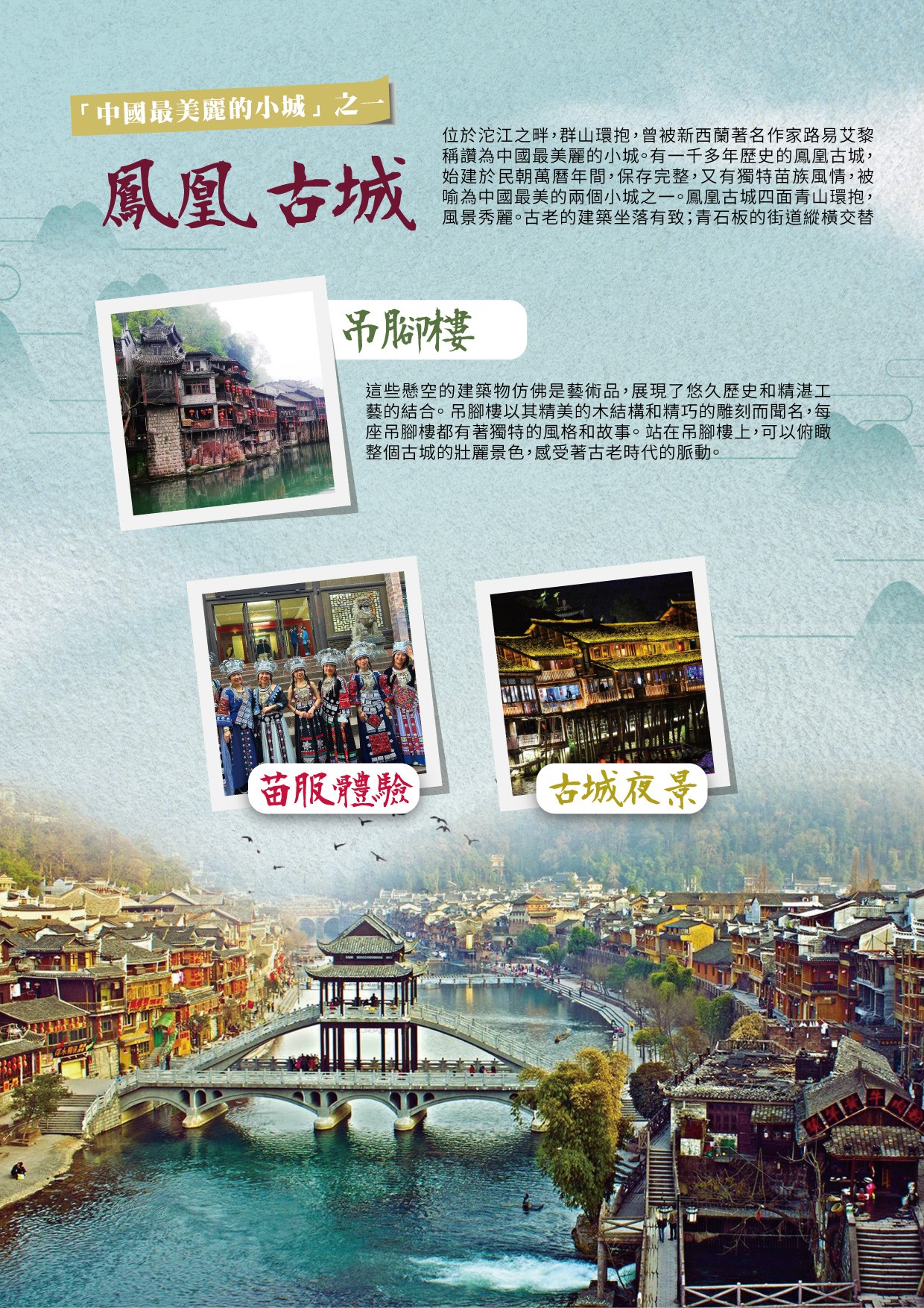 【鳳凰古城】位於沱江之畔,群山環抱,曾被新西蘭著名作家路易艾黎稱讚為中國最美麗的小城。有一千多年歷史的鳳凰古城,始建於民朝萬曆年間,保存完整,又有獨特苗族風情,被喻為中國最美的兩個小城之一。鳳凰古城四面青山環抱,風景秀麗。古老的建築坐落有致;青石板的街道縱橫交替。東嶺迎暉,南華疊翠、山寺晨鐘、龍潭漁火、奇峰綿綿。
